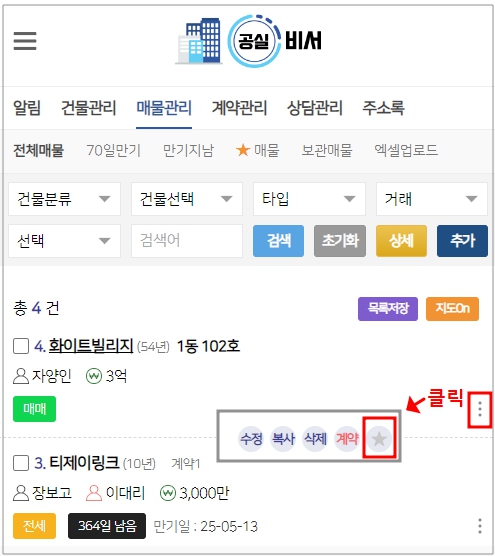 ③ 즐겨찾기로 설정한 매물은 매물관리 > 즐겨찾기에서 확인하실 수 있습니다.