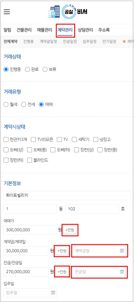 TIP) 보증금, 계약금 등 숫자 단위로 입력할 금액의 경우, +만원 버튼을 클릭하면 만원 단위로 자동 환산됩니다.