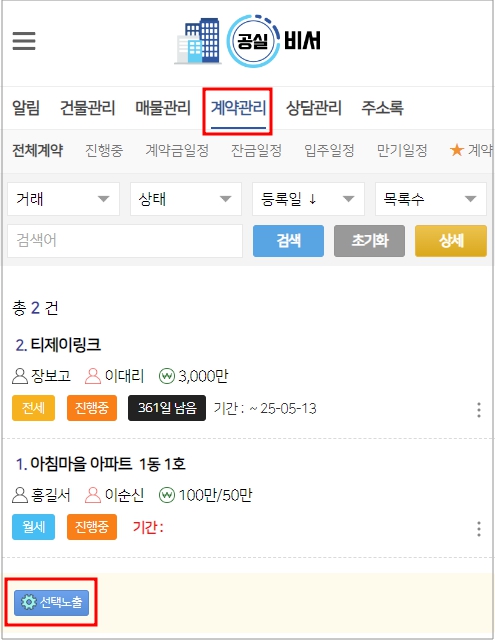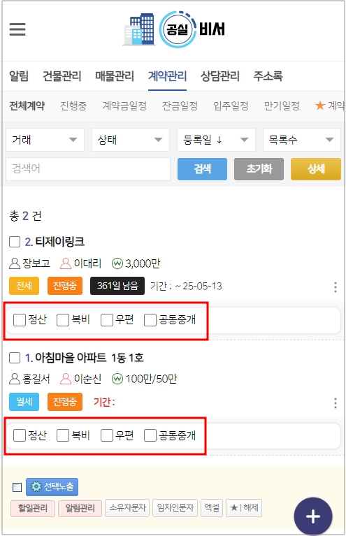 - 계약된 매물에 대한 관리 업무를 체크 유/무로 쉽게 관리할 수 있습니다.