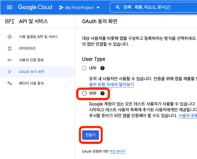 Step 2. OAuth 동의 화면에서 User Type '외부' 선택 후 만들기를 누르세요.