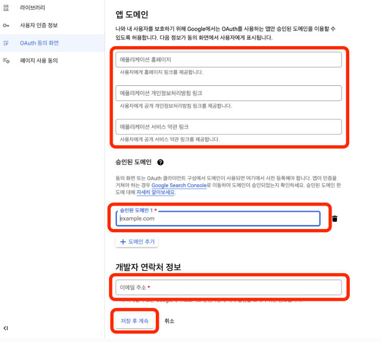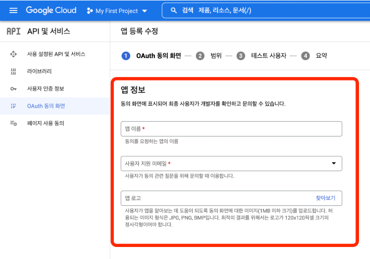 Step 3. 아래 이미지와 설명을 참고하여 OAuth 동의 화면을 설정해 주세요.