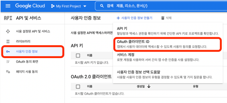Step 2. 아래 이미지와 설명을 참고하여 OAuth 클라이언트 ID를 만드세요.