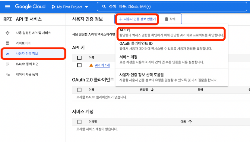Step 1. 사용자 인증 정보 - +사용자 인증 정보 만들기 - API키 클릭하면 API 키가 생성