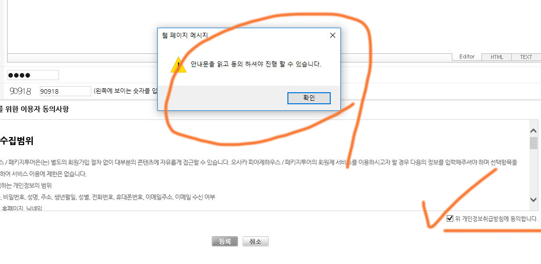 그런데, 비회원이 글을 올릴때 개인정보취급방침에 동의합니다 옆의 체크박스가 체크되어있음에도 불구하고 아래와 같은 오류창이 뜹니다.
