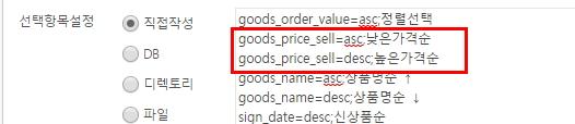 1. 편집화면에서 '낮은가격순', '높은가격순' 항목을 클릭 > 수정