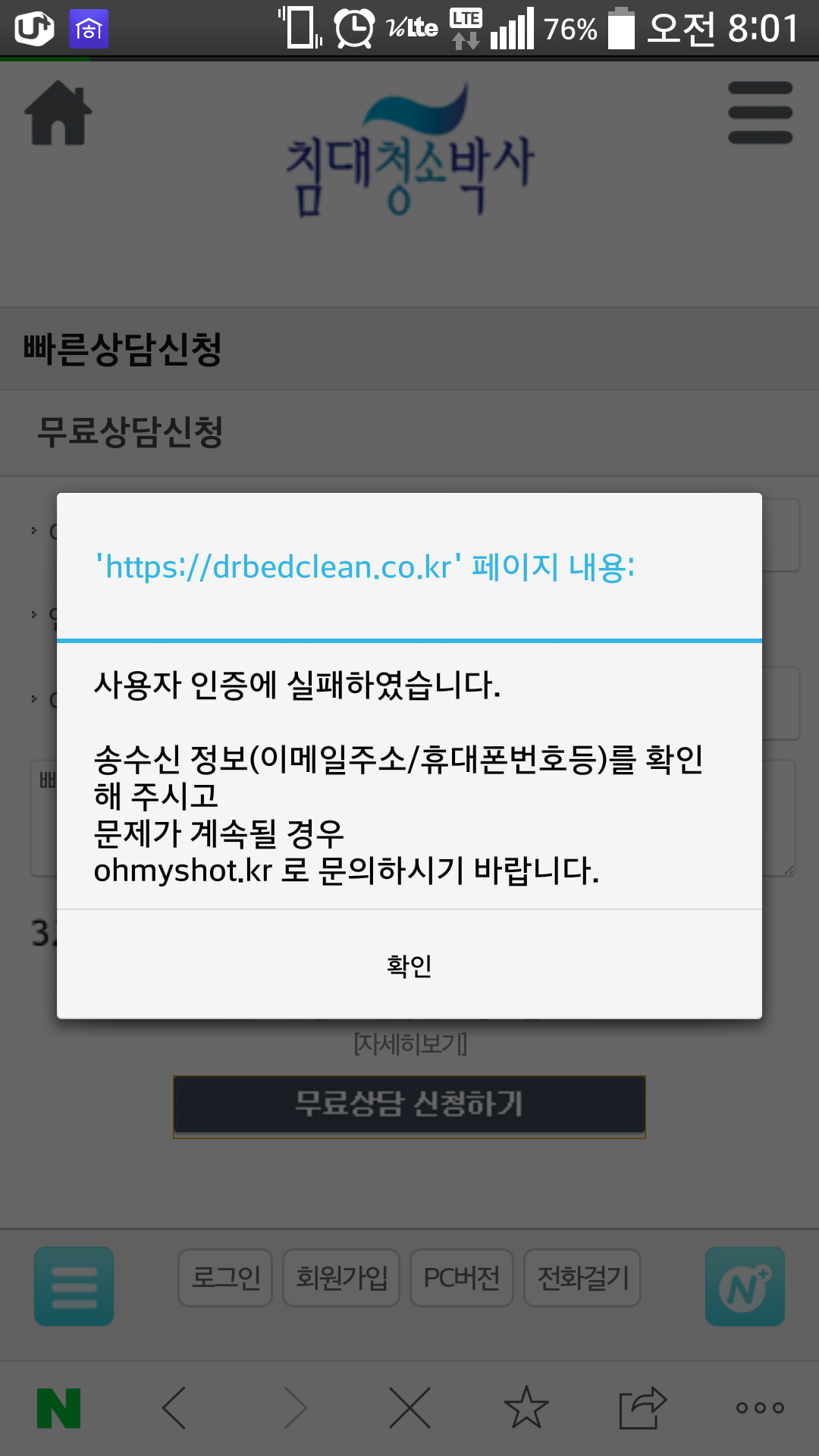 하지만 사이트의 빠른 상담 신청폼에서 신청인이 빠짐없이 칸 입력시 아래와 같은 팝업창이 띕니다.