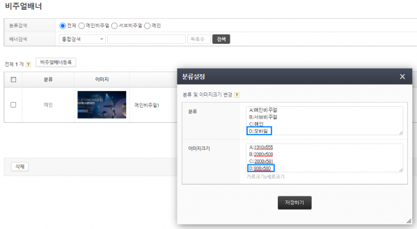 저장하신 후에는 비주얼배너에 들어갈 이미지를 위에 수정하신 값과 동일하게 편집하신 후, 다시 올려주셔야 이미지가 정상적으로 나옵니다.