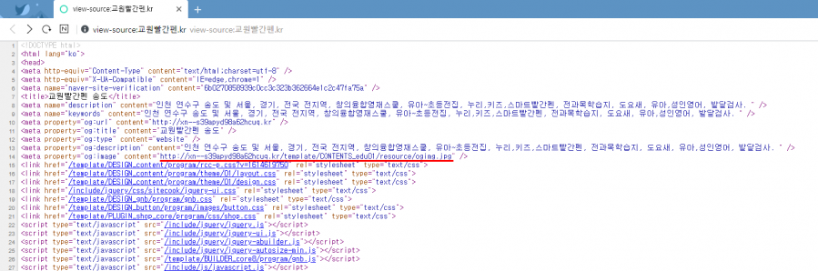 사이트 메인화면에서 마우스 오른쪽 버튼 클릭 > '페이지소스보기'클릭하시면 아래 이미지와 같이 화면이 나옵니다.