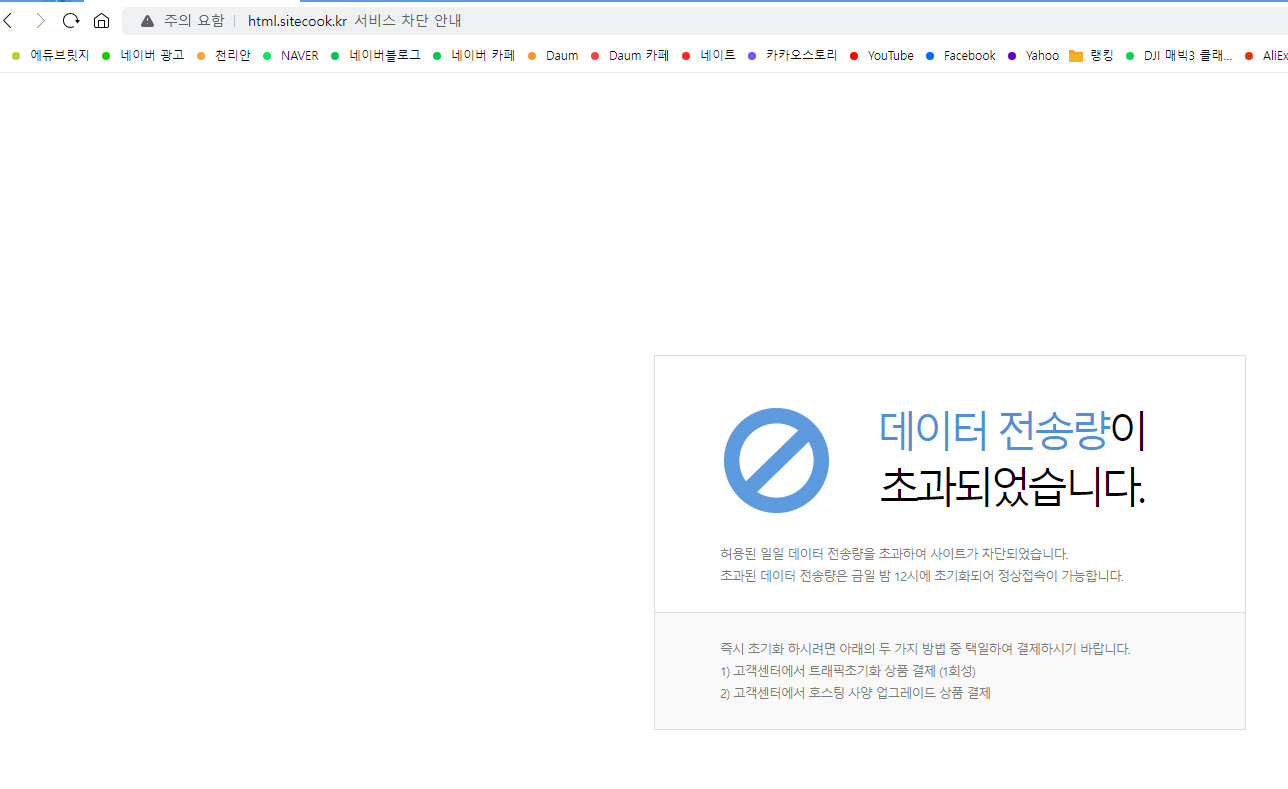 지난 주말부터 오후 시간에 저희 홈페지이를 열 때, 다음과 같은 메세지가 나옵니다. "데이터 전송량이 초과되었습니다."