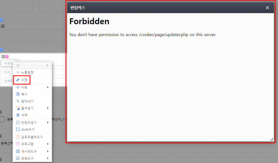 저희가 모바일로 핸드폰 IP를 웹방화벽에 추가한 후, 문의 주신 페이지의 주소 항목을 수정 시도한 결과 정상적으로 수정되는 것을 확인했습니다.