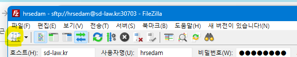 FileZilla에서 ftp접속 사이트 정보 등록을 아래 이미지를 참고하여 해당 아이콘을 클릭하여 사이트 관리자창에서 정보 입력 후 다시 한 번 연결 시도해 주시기 바랍니다.