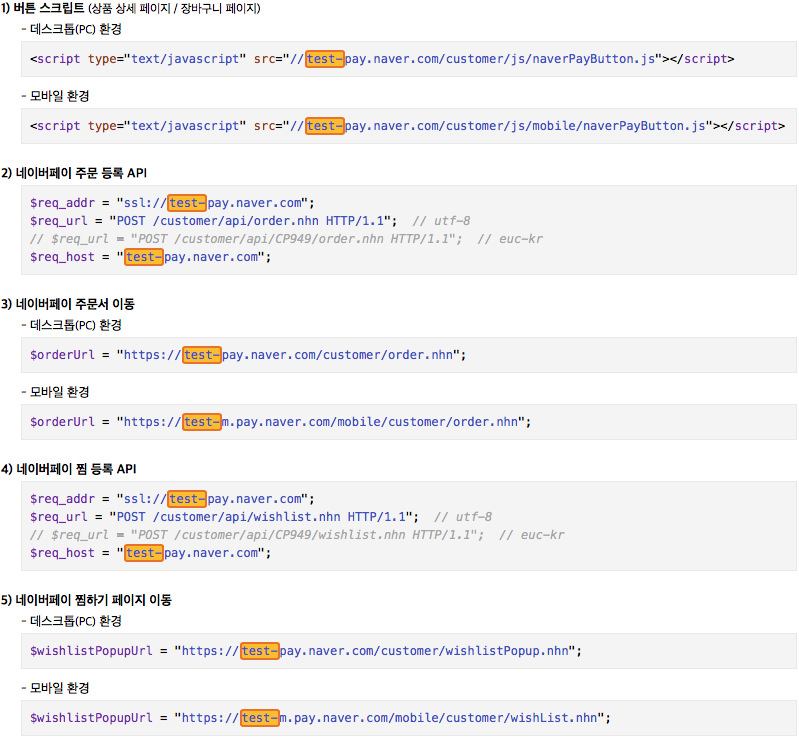 네이버페이 주문 등록(구매하기)/찜 등록(찜하기)  모든 네이버페이 서비스 도메인에서의 test-을 추가하시면 됩니다.