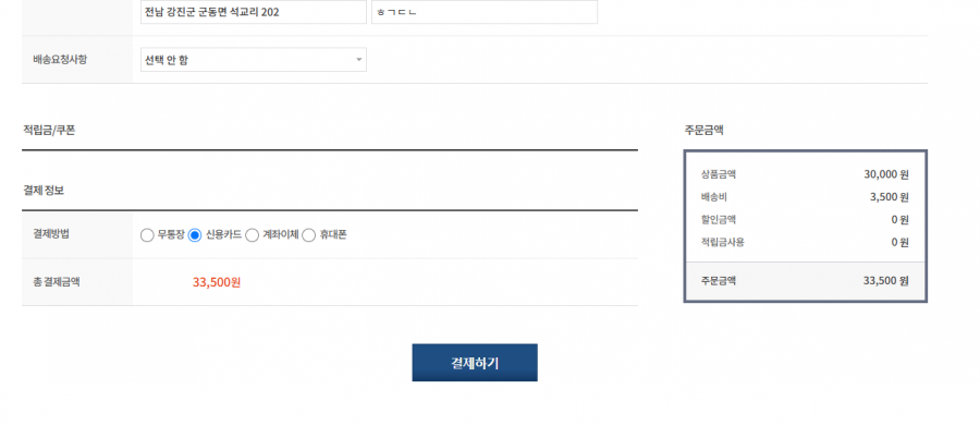 상품 결제를 누르고 정보를 입력한후 신용카드 결제하기 누르면