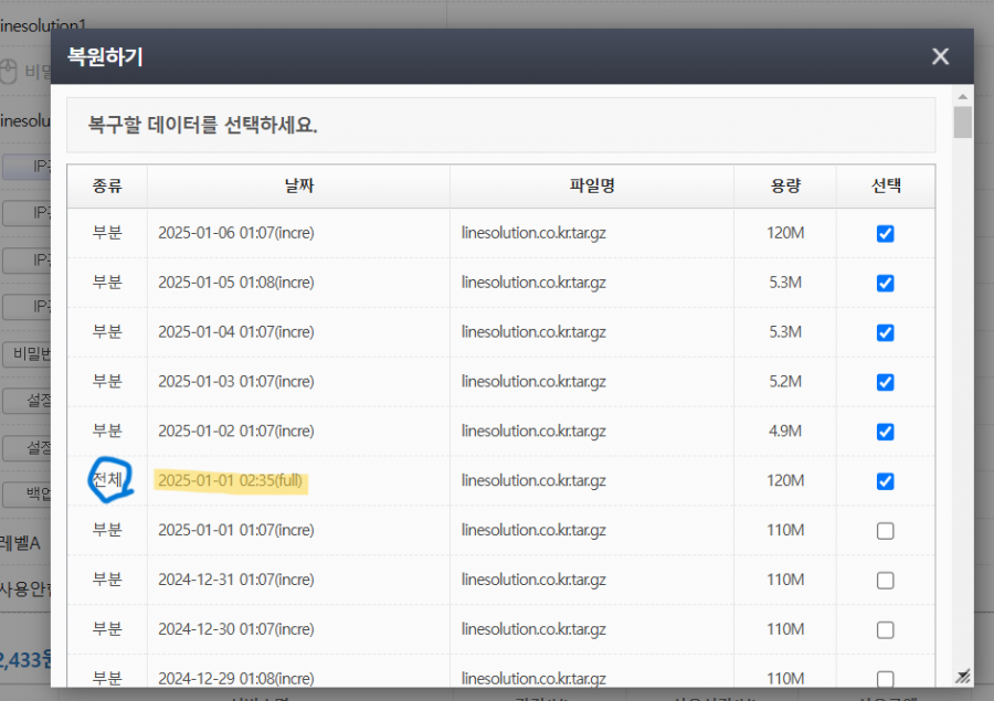 예를 들어, 1월의 데이터를 복구하려는 경우, 1월 1일 전체라고 되어있는 항목을 체크하셔야 합니다.