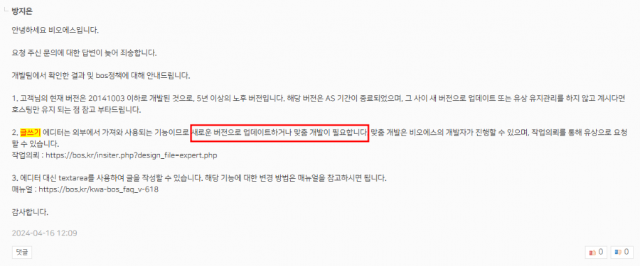 글쓰기 에디터는 외부에서 가져와 사용되는 기능이므로 새로운 버전으로 업데이트하거나 맞춤 개발이 필요합니다.