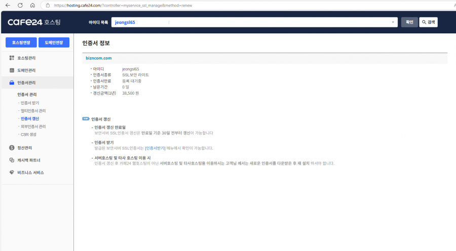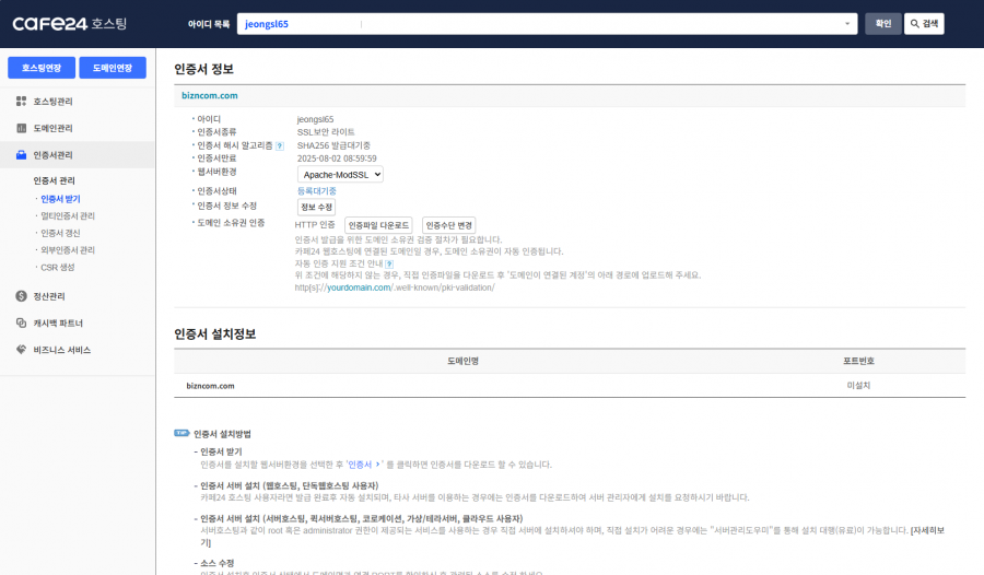 여전히 카페24에 인증대기중으로 나오며