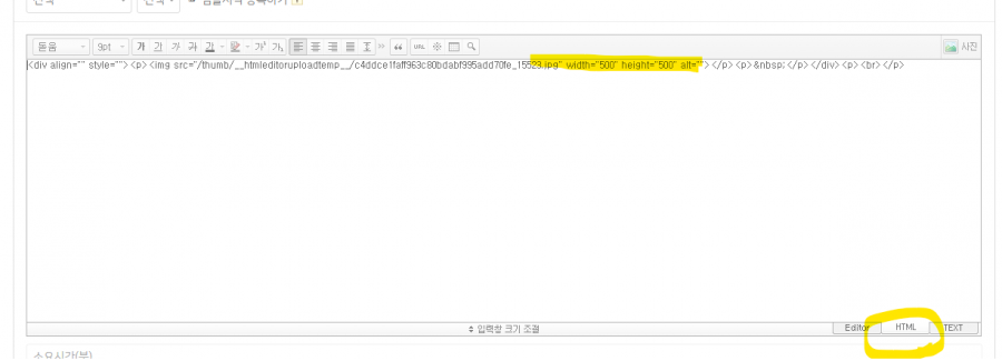 이미지를 첨부하신 후 HTML 편집 모드로 전환하여, <img> 태그의 width나 height 속성값을 변경하시면
