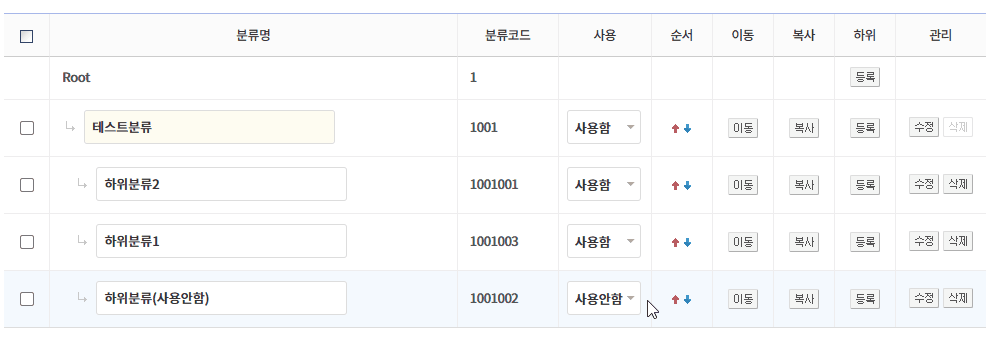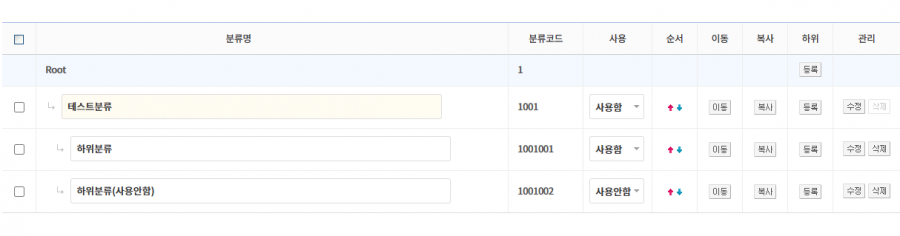 - 상품분류관리 페이지 - 순서의 위 아래 버튼을 통해 분류 순서를 변경할 수 있습니다.