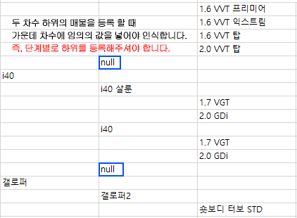 예시) 1차분류 : 국산차 / 2차분류 : 현대 / 3차 분류 i30 · · ·