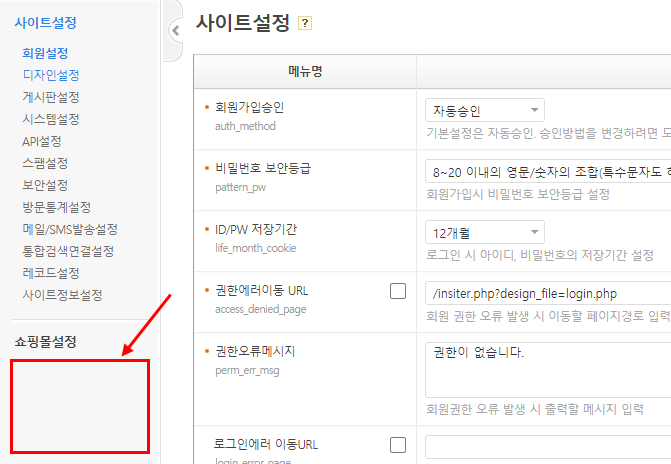 쇼핑몰 기능을 추가하셨는데 관리자홈 > 설정변경 > 쇼핑몰 설정에서 하위메뉴가 보이지 않는 경우가 있습니다.