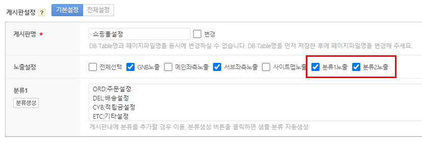 2. 쇼핑몰설정이 보이지 않는 경우, 분류1노출과 분류2노출에 체크가 안 되어 있는 상태입니다.
