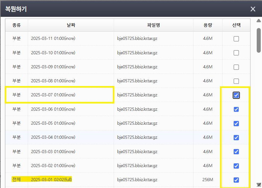· 예시) 복원날짜 3월7일일 경우, 3월 1일 전체(full)부터 3월7일까지 체크