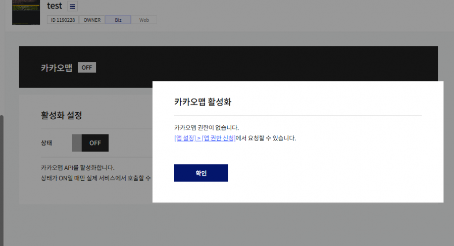 참고: 카카오맵 기능을 활성화하려면 해당 앱을 비즈앱으로 전환해야 합니다.