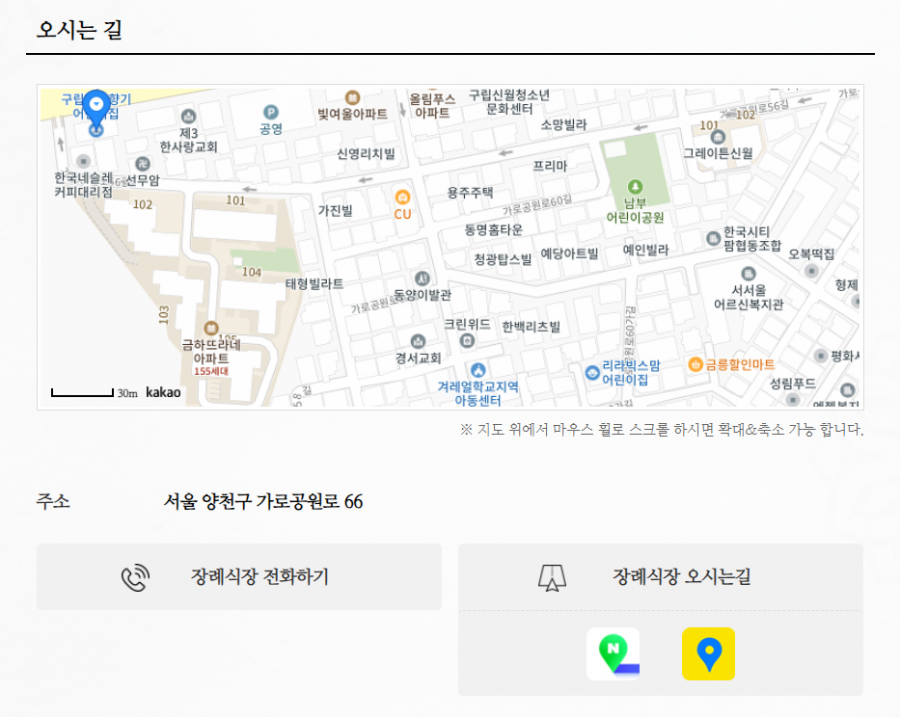 1. 장례식장 전화하기, 오시는길(카카오맵/네이버지도 연동)