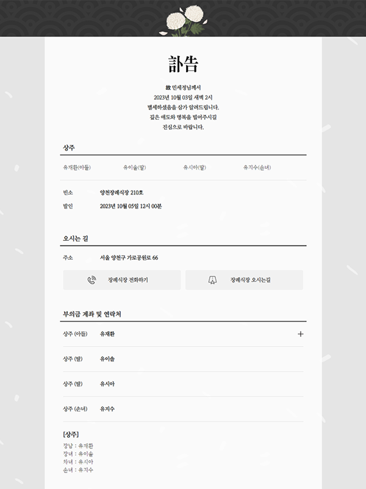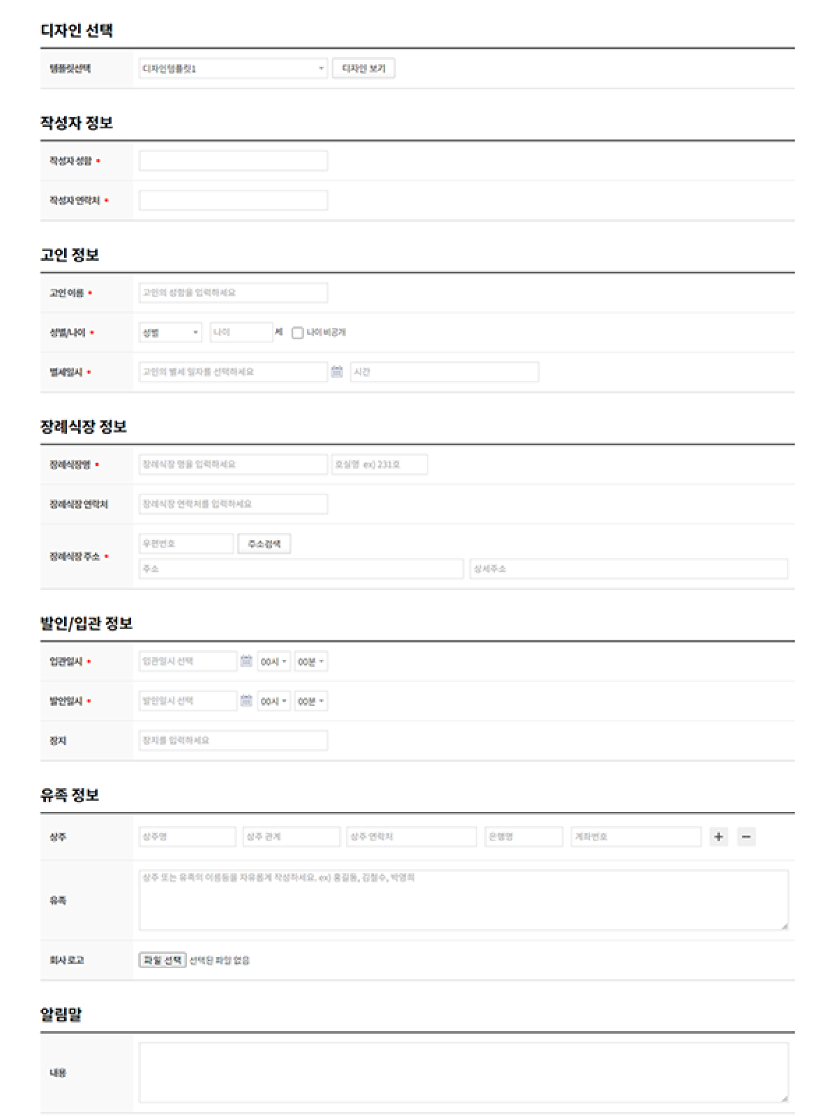 고인정보, 상주정보(추가가능), 부고알림말, 부고메시지, 장례식장 정보 등을 작성하여 손쉽게 URL로 전송할 수 있습니다.