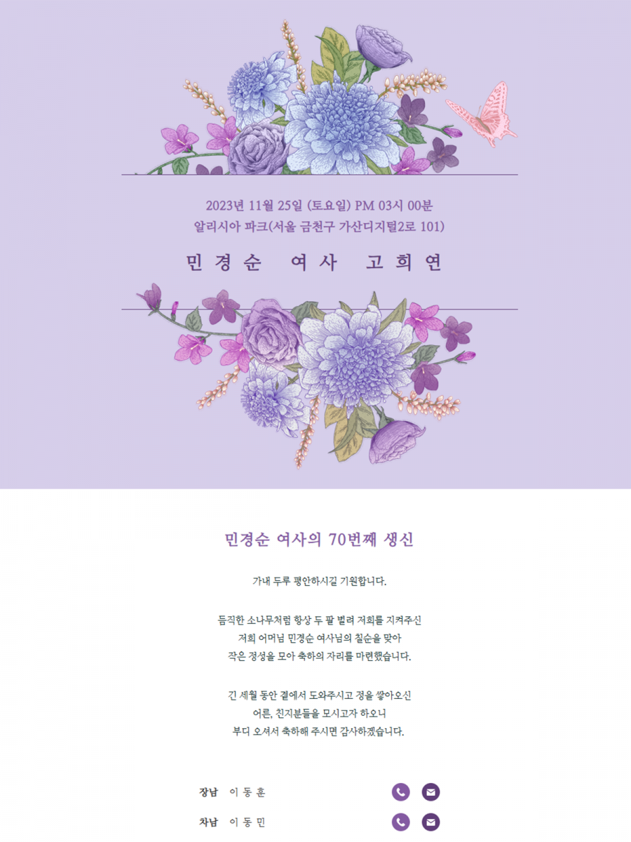 돌잔치, 환갑잔치, 고희연 등에 손님을 초대할 때 손쉽게 URL로 전송할 수 있습니다.