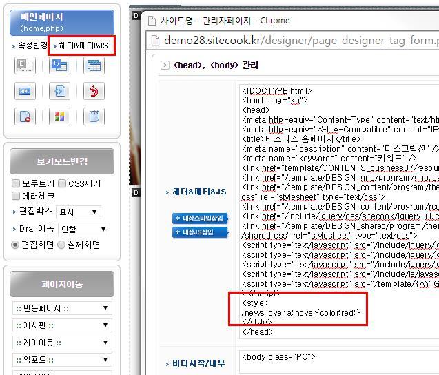 2. 해당 페이지 편집화면에서 좌측 상단의 헤더&메타&JS 클릭 > </head> 바로 윗줄에 아래내용을 추가합니다.