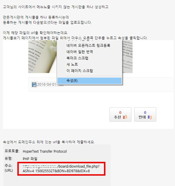 매뉴얼을 따라 비공개 게시판에 sitemap.xml 파일을 업로드 한 후 '우클릭' 후 속성에서 주소를 복사하려고 시도하는데요.