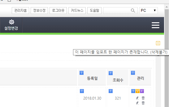 각 페이지의 편집화면에 들어갔을 때 우측 상단에 노란색 I아이콘이 떠있는 페이지는