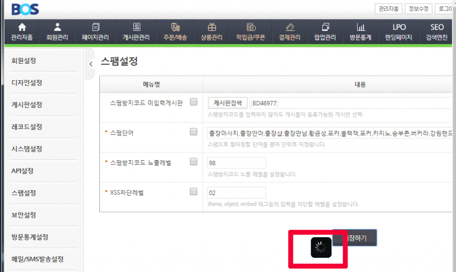 2. Q&A 게시판에서 스팸방지 코드를 입력하지 않게 하려고, 아래와 같이 등록하여 저장을 누르면 로딩 상태가 지속됩니다. 한두시간 이상 기다려 보기도 했는데, 결국 저장은 되지 않더라고요. 확인 부탁드리겠습니다~ 고맙습니다!