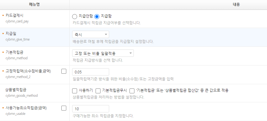 아래 이미지를 보시면 고정 또는 비율 일괄적용하여 0.05의 적립금을 지급한다는 설정입니다.