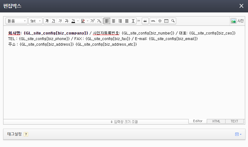 기존 메일스킨의 푸터영역의 정보는 사이트정보설정의 값을 자동으로 불러와 노출시키는 치환변수로 구조화가 되어있습니다.
