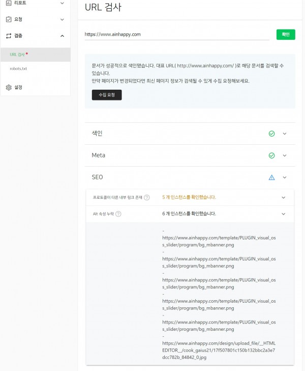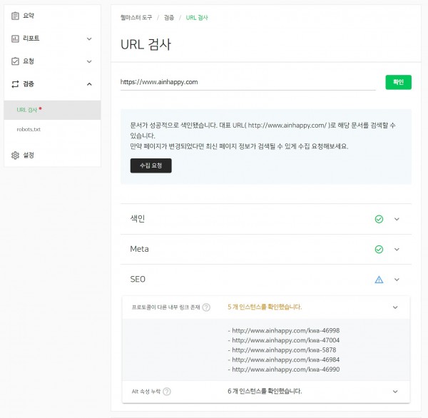유선 상으로 https://www.ainhappy.com으로 다시 등록을 해주셨다고 하셨는데, 네이버웹마스터측에서