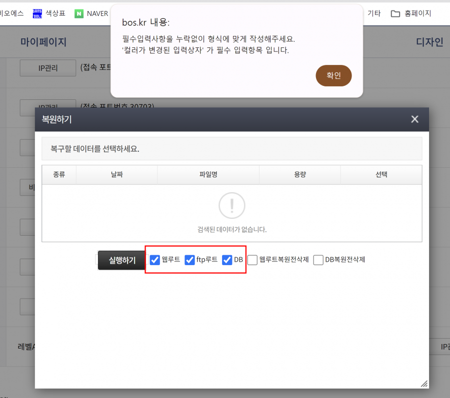 복원하기에서 3가지를 체크했는데 얼럿이 뜹니다.