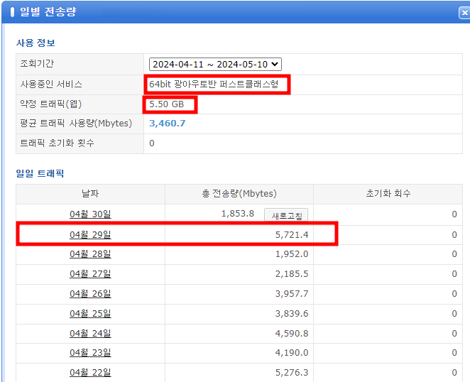퍼스트클래스형의 일일 트래픽용량이 5.5GB인데, 어제는 5.7로 초과되어 차단이 된것 같습니다.