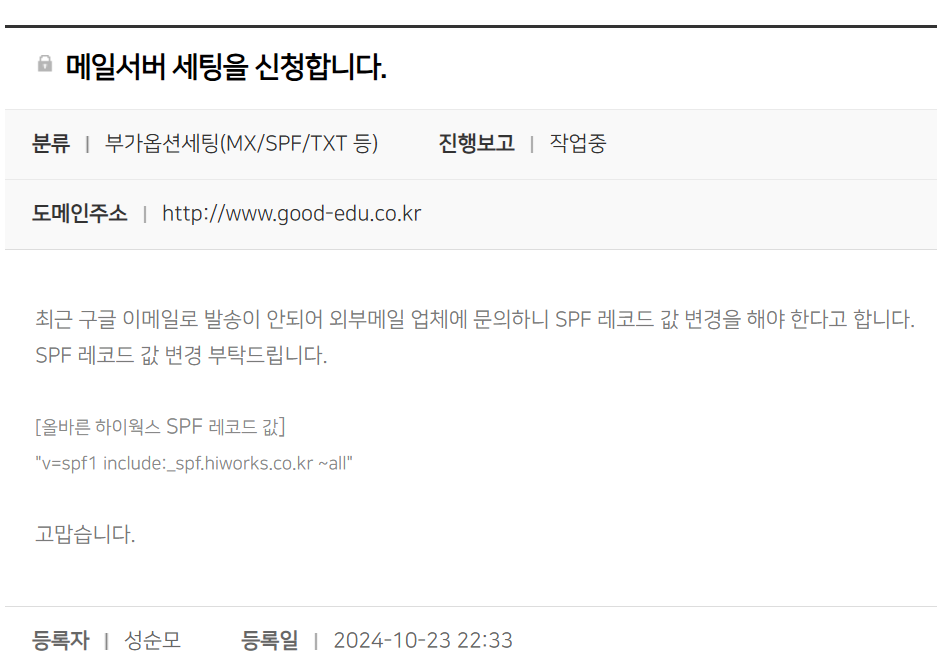고객님께서 요청하신 SPF 레코드 값으로 변경이 완료되었습니다.