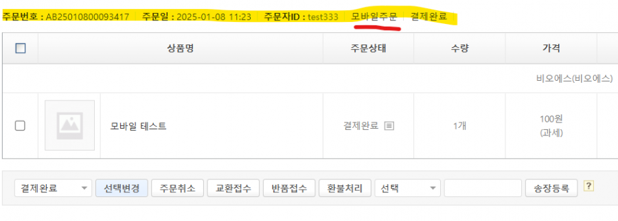 모바일에서 결제 테스트 진행한 결과 정상적으로 결제가 완료되는 것을 확인 하였습니다.
