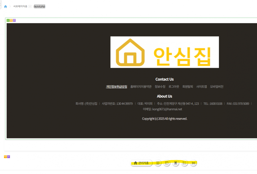 해당 페이지에서 세 번째 버튼인 레이아웃 버튼을 클릭하신 후, layout.php(서브 레이아웃)의 하단에 관리자 버튼이 import되어 있습니다.