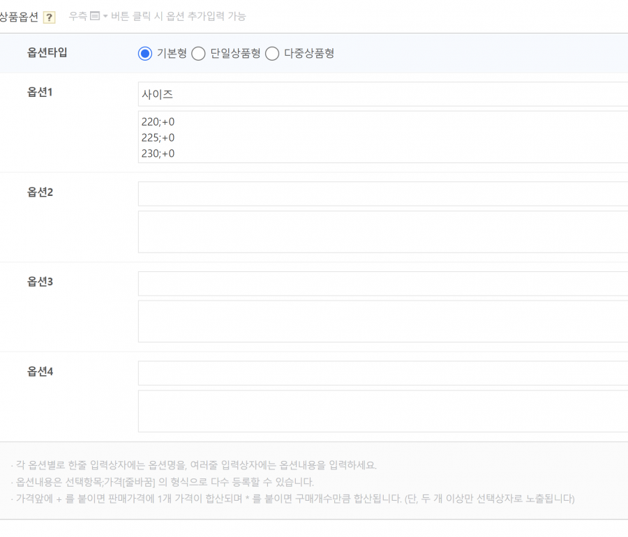 안녕하세요 쇼핑몰에서 옵션을 아래처럼 입력하면