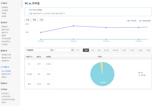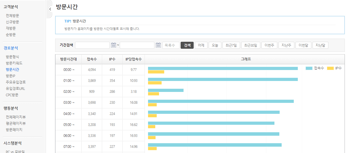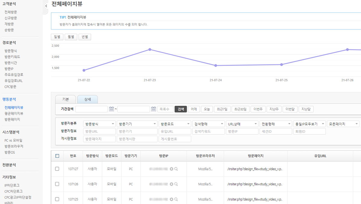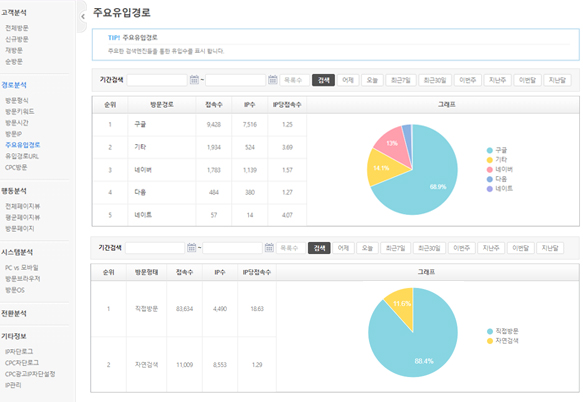 방문형식별, 키워드별, 시간별, IP별 등으로 다르게 분석한 결과를 제공합니다.