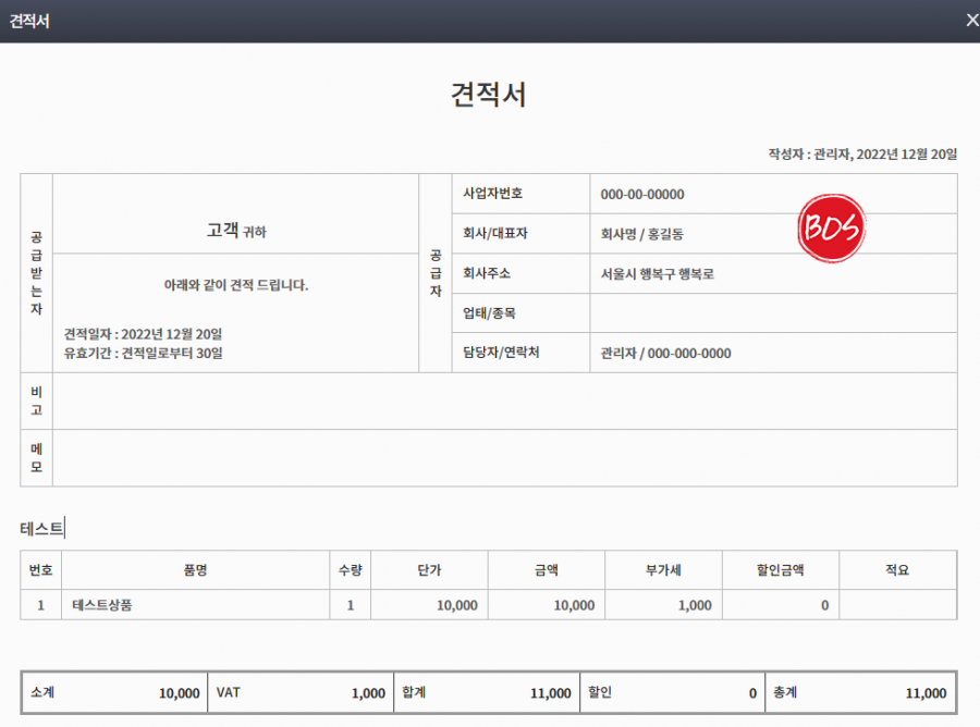 ) 버튼을 클릭하면 아래와 같이 견적서를 확인할 수 있습니다.