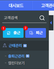 · 좌측 상단의 출근/퇴근 버튼으로 직원들의 출퇴근을 관리할 수 있는 페이지 입니다.