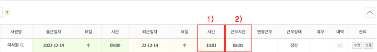 ▼ 퇴근 버튼 클릭 시, 퇴근 시간 및 일일근무시간이 등록된 상태