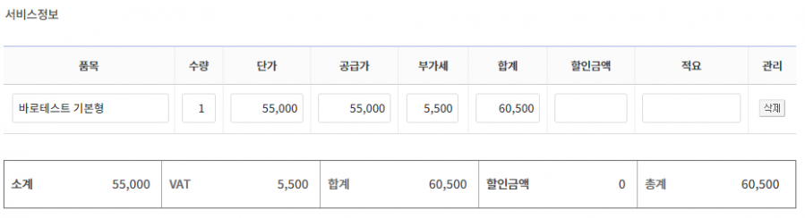 ③ 상품 선택을 하면 서비스 정보에 품목, 수량, 단가, 공급가, 부가세, 합계가 자동으로 입력됩니다.
