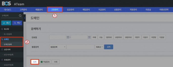 · 고객관리 > 고객(업체)명 검색 > 고객리스트 > 도메인 등록 버튼을 클릭합니다.