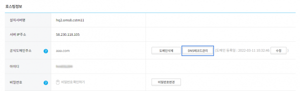 공식도메인주소 항목에 있는 [DNS레코드관리] 버튼을 클릭해주세요.